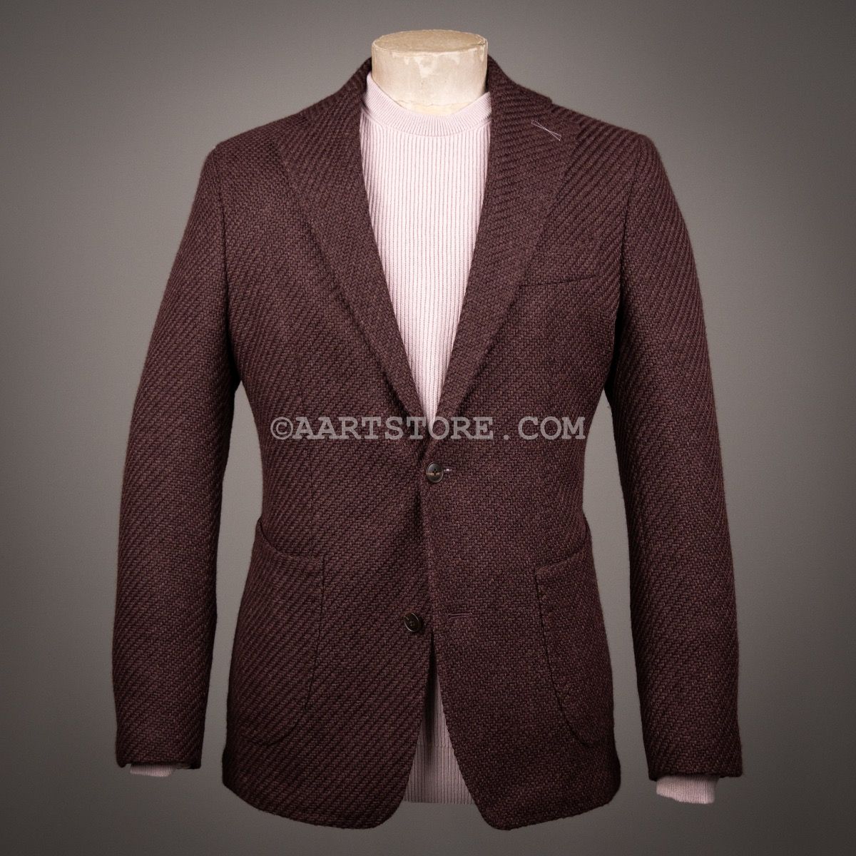 Dit jasje uit de AART collectie is gemaakt volgens de Napolitaanse school. Gesneden met een extreem dunne, zachte schouder en zonder kopwatte voor een ontspannen uitstraling. Tegelijkertijd heeft het jasje wel een full canvas constructie, het kenmerk van kleermakerskunst. Dit jasje is gesneden uit een stof van Ferla. Dit oude, Italiaanse stoffenhuis is de specialist in structuurstoffen in luxe materialen, zoals hier Alpaca. Dit jasje heeft een uniek, haast gevlochten weefpatroon dat het sportief chique uitstraling geeft. De kleur doet denken aan oude port, een bruine/rode kleur die mooi staat bij allerlei kleuren beige, van heel licht tot donker Havana.