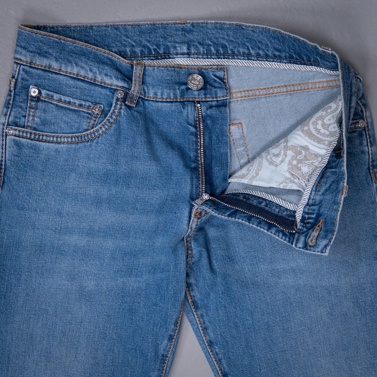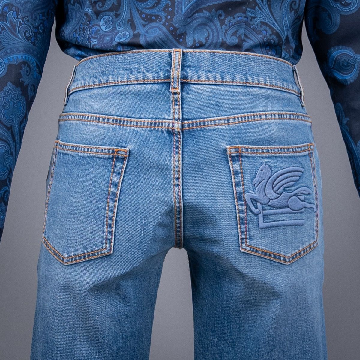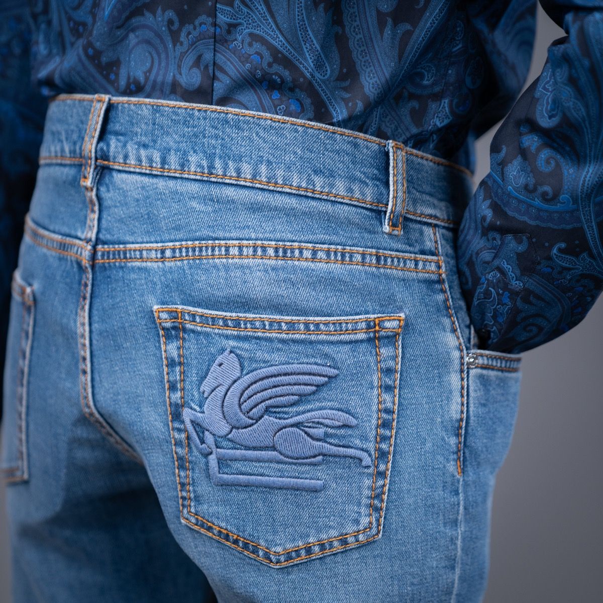 Etro was oorspronkelijk een familiebedrijf in interieurstoffen. Een merk waar uitbundige kleuren en vrolijke ontwerpen samengaan tot een stijlvol geheel. Deze toewijding aan kleur en ontwerp zie je terug in de Etro jeans. Het is een authentiek afgewassen denim met de kenmerkende Pegasus op de achterzak. De pasvorm is een beetje non fit, precies zoals nu haute fashion is. Deze jeans past uiteraard perfect bij de rest van de Etro collectie, maar ook bij een stoere stijl als echte denim.