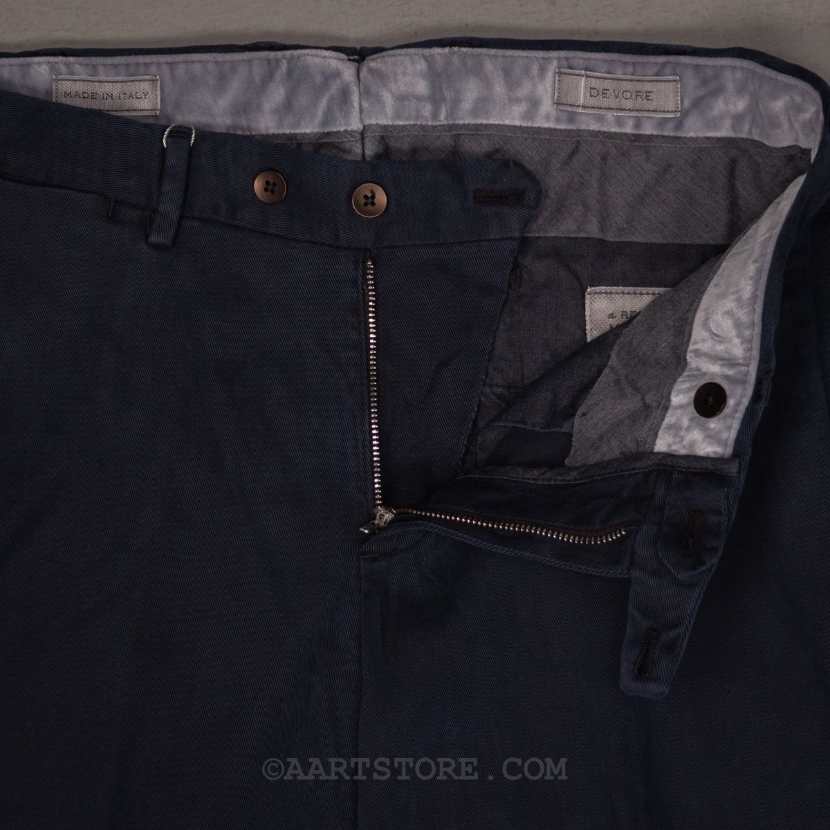 Devore is een Napolitaanse broekenspecialist. Jarenlang maakte dit familiebedrijf vooral broeken voor andere partijen en hierdoor staan ze in de business bekend als een uiterst vakkundige en betrouwbare partner. Sinds een paar jaar maakt Devore hun eigen collectie; bijzonder mooi gemaakte broeken voor een alleszins redelijke prijs. De constructie is prachtig gemaakt van verschillende materialen waardoor een speels effect ontstaat. De broekband is een uitvinding van Devore, de Flexowaist geeft extra comfort bij bewegen en zitten zonder dat de broek afzakt. Het model is eigentijds, met iets meer ruimte en een pasvorm die toeloopt naar de voet. Deze Fall twill chino is een nieuwe stof die heel zacht en rijk voelt. Gemaakt van katoen, Lyocel (Eucalyptustak) en stretch biedt dit materiaal comfort en bewegingsvrijheid. Deze chino is clean genoeg om hem te dragen bij een jasje, maar uiteraard ook bij een trui of andere knitwear. (NB. de lengte van de Devore broeken is aangepast, ze zijn iets langer dan voorheen waarbij de grotere maten meer langer zijn geworden. Nu vergelijkbaar met o.a. Jacob Cohën).