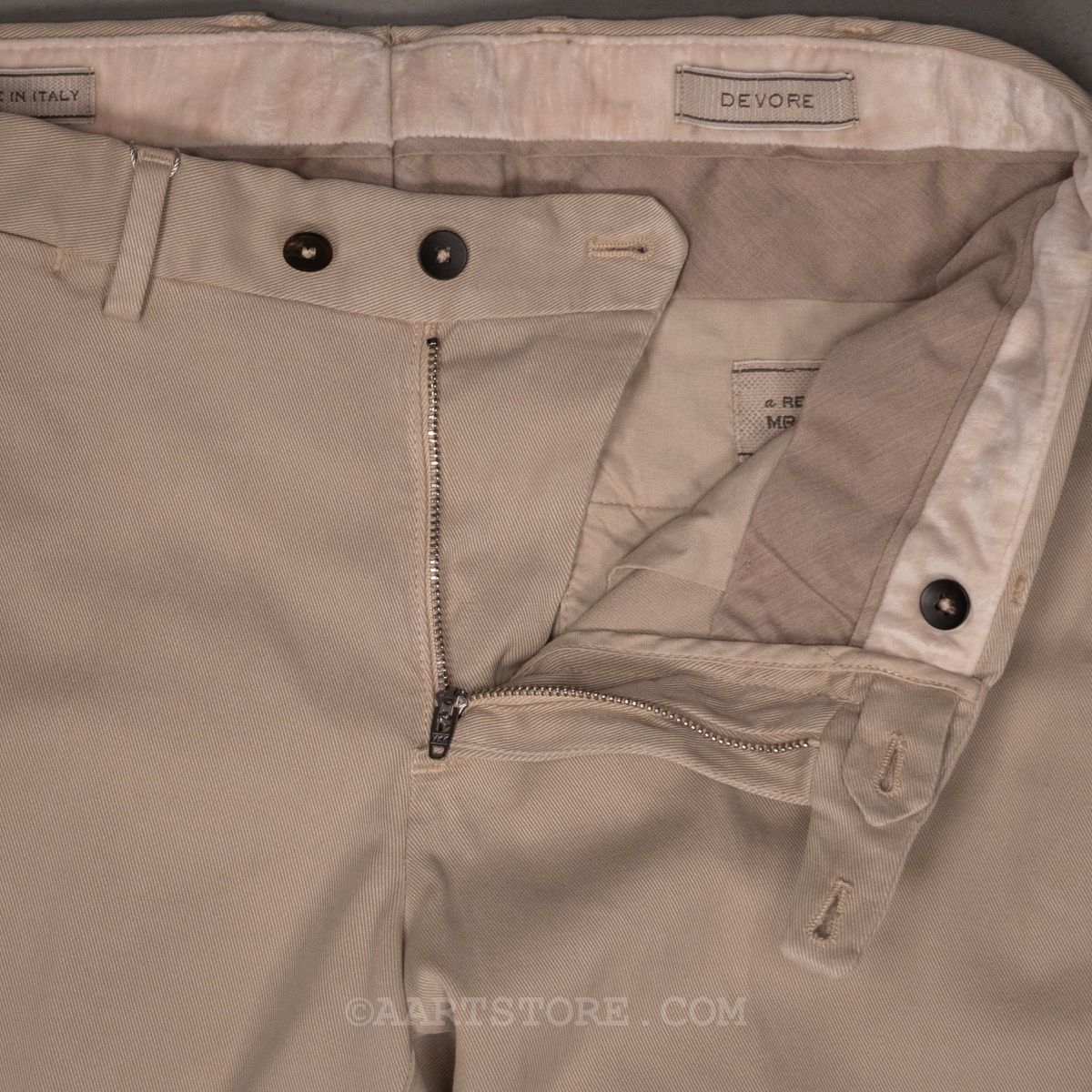 Devore is een Napolitaanse broekenspecialist. Jarenlang maakte dit familiebedrijf vooral broeken voor andere partijen en hierdoor staan ze in de business bekend als een uiterst vakkundige en betrouwbare partner. Sinds een paar jaar maakt Devore hun eigen collectie; bijzonder mooi gemaakte broeken voor een alleszins redelijke prijs. De constructie is prachtig gemaakt van verschillende materialen waardoor een speels effect ontstaat. De broekband is een uitvinding van Devore, de Flexowaist geeft extra comfort bij bewegen en zitten zonder dat de broek afzakt. Het model is eigentijds, met iets meer ruimte en een pasvorm die toeloopt naar de voet. Deze Fall twill chino is een nieuwe stof die heel zacht en rijk voelt. Gemaakt van katoen, Lyocel (Eucalyptustak) en stretch biedt dit materiaal comfort en bewegingsvrijheid. Deze chino is clean genoeg om hem te dragen bij een jasje, maar uiteraard ook bij een trui of andere knitwear. (NB. de lengte van de Devore broeken is aangepast, ze zijn iets langer dan voorheen waarbij de grotere maten meer langer zijn geworden. Nu vergelijkbaar met o.a. Jacob Cohën).