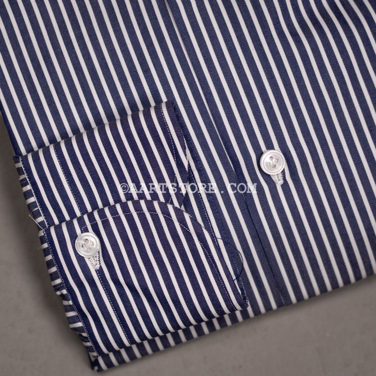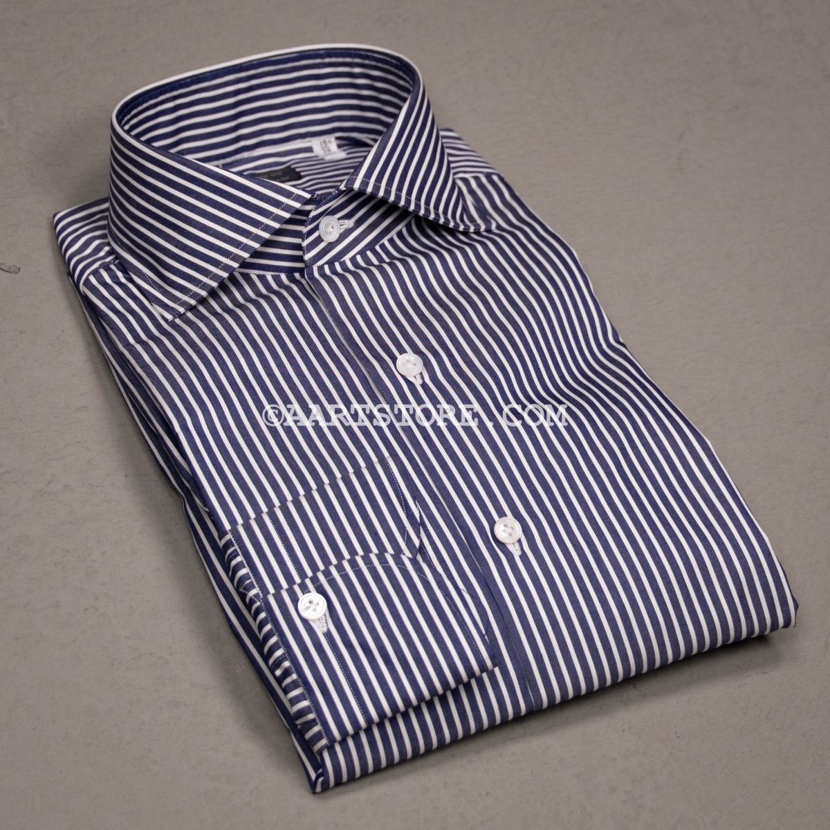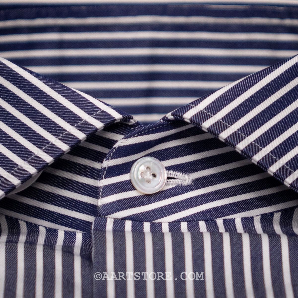 De shirts van Finamore behoren tot de wereldwijde top. Met veel handgemaakte details is dit het perfecte Napolitaanse shirt. De kraag is met een handsteek vastgezet, de mouwen hebben typisch Italiaanse plooitjes. De pasvorm is aan het lichaam gesneden maar wel met voldoende comfort met een genereuze lichaams- en mouwlengte. Dit shirt is gesneden uit een doppio ritorto doek met een reverse effect brede streep, perfect bij een pak of blazer pak. Maar ook mooi op een jeans met een navy trui. Een kleine waarschuwing: het dragen van Finamore shirts kan verslavend werken…