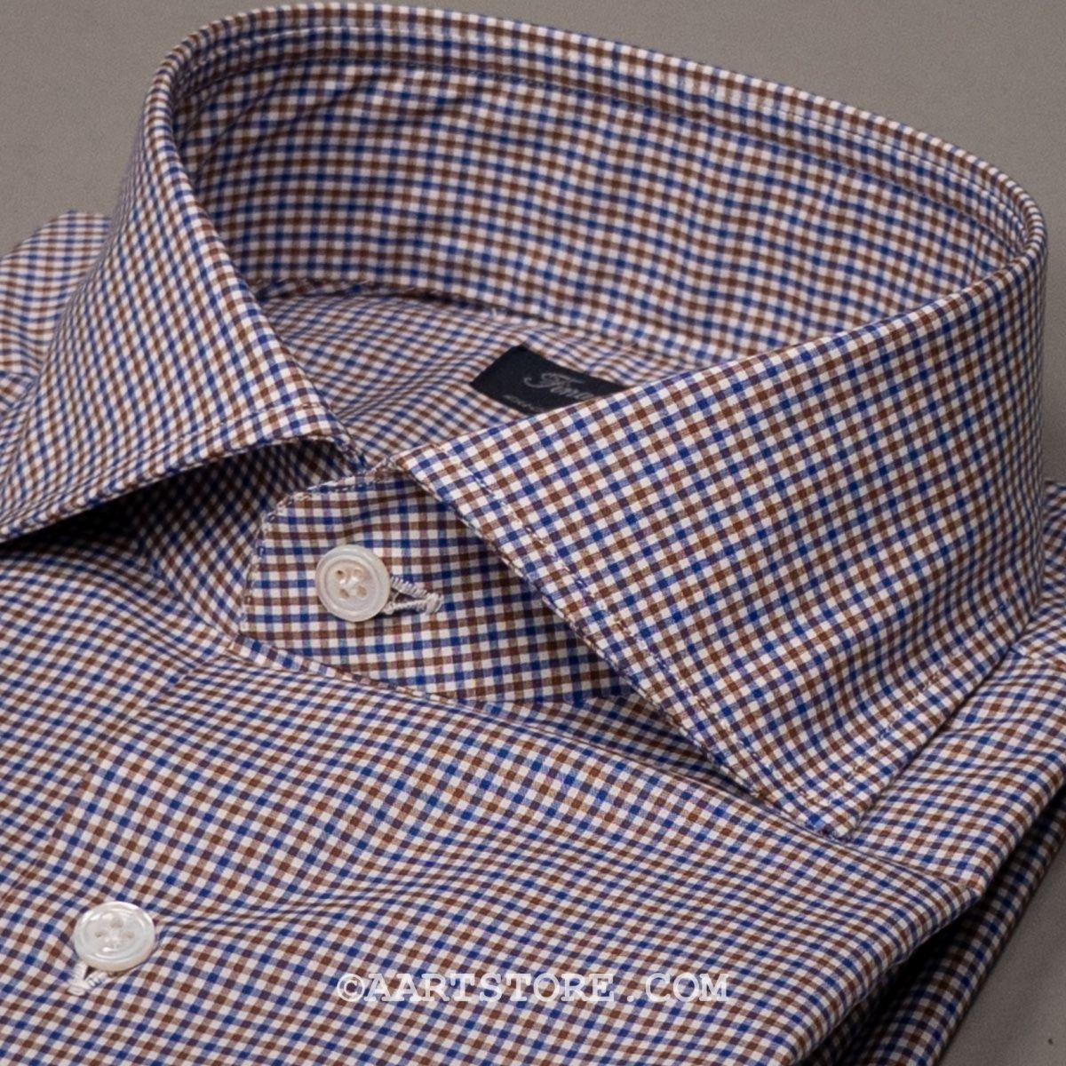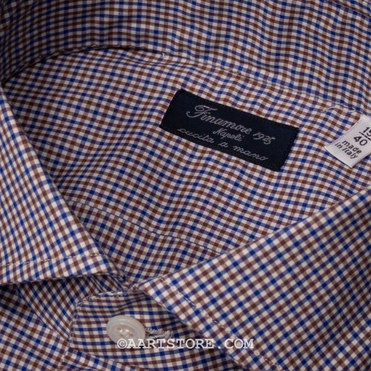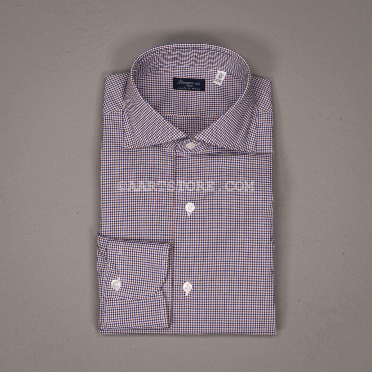 De shirts van Finamore behoren tot de wereldwijde top. Met veel handgemaakte details is dit het perfecte Napolitaanse shirt. De kraag is met een handsteek vastgezet, de mouwen hebben typisch Italiaanse plooitjes. De pasvorm is aan het lichaam gesneden maar wel met voldoende comfort met een genereuze lichaams- en mouwlengte. Dit shirt is gemaakt van een Engelse stof, een compact doek dat dun maar toch stevig is. Echt een shirt dat je al dragend steeds meer zult waarderen; het kreukt nauwelijks en blijft correct vallen. Zoals de meeste Finamore shirts is dit draagbare luxe, die verslavend kan werken.