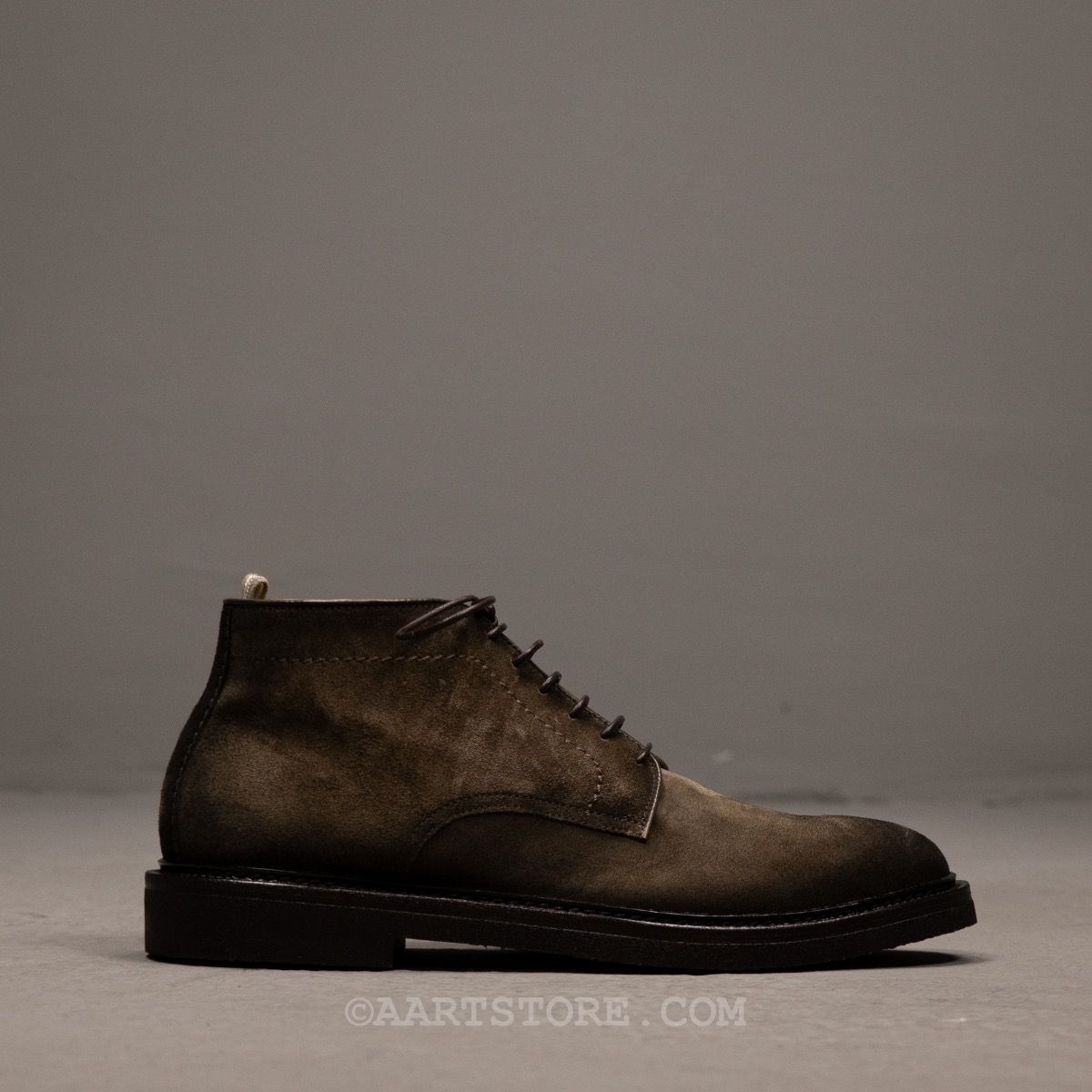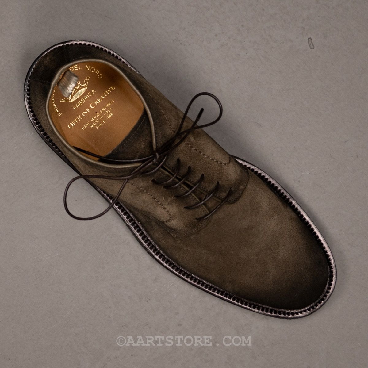Officine Creative is een Noord-Italiaanse schoenmaker die de dingen op een traditionele manier net anders doet. De schoenen worden met de hand gemaakt op de traditionele (correcte) manier, maar de modellen en de finishing maakt dit juist eigentijds en cool. De Hopkins is Officine’s versie van de tijdloze dessertboot. Gemaakt van fijne ‘cashmire’ suède, een kwaliteit die een rijke uitstraling combineert met zachtheid. Het hand geverfde kleureffect geeft de schoen een casual effect dat perfect past bij vintage denims en corduroy. De constructie heeft een zachte leren tussenzool met een lichtgewicht caoutchouc (natuurlijk rubber) buitenzool. De schoen ziet er robuust uit maar is juist heel licht en daarmee heel plezierig om te dragen, elke dag weer.