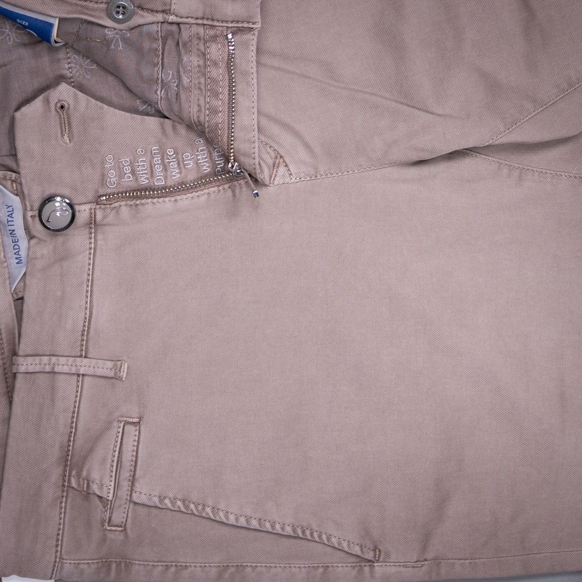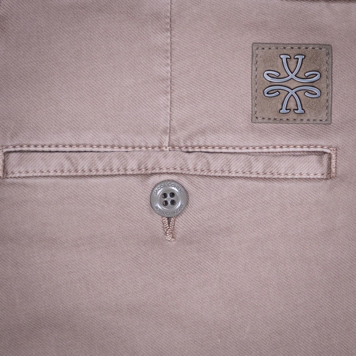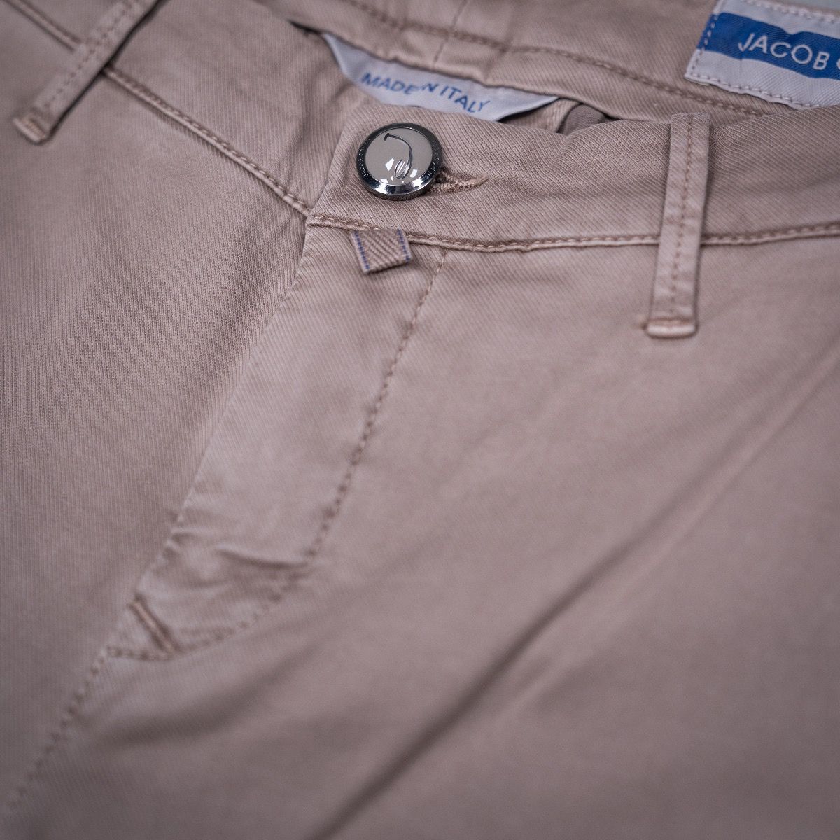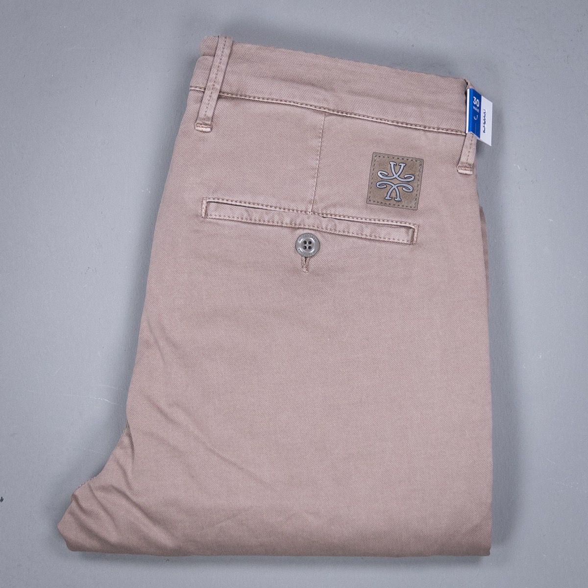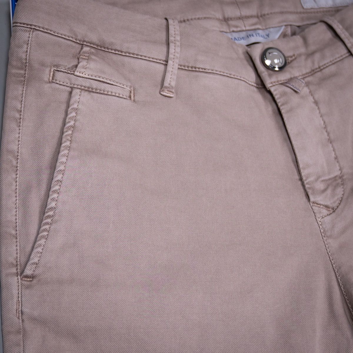 Naast fantastische jeans maakt Jacob Cohën ook een coole chino: de Bobby. De naam is een verwijzing naar Bobby Kennedy, een icoon van casual cool. Het verschil zit in de details en de pasvorm; slank en toch comfortabel. Voor voorjaar 2023 is gekozen voor een dubbele, zachte cavalry twill, voldoende elastisch maar ook vormvast, zacht en comfortabel. Marrone is het Italiaanse woord voor kastanje, maar dan de zomerse versie, eigenlijk meer de kleur van kastanje roomijs; een prachtige kleur. Deze tint is perfect bij veel blauwe en bruine jasjes zeker in combinatie met een lichtblauw shirt.