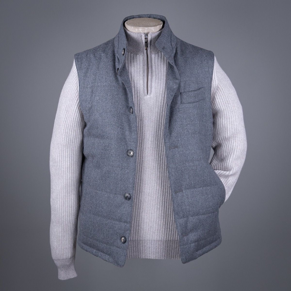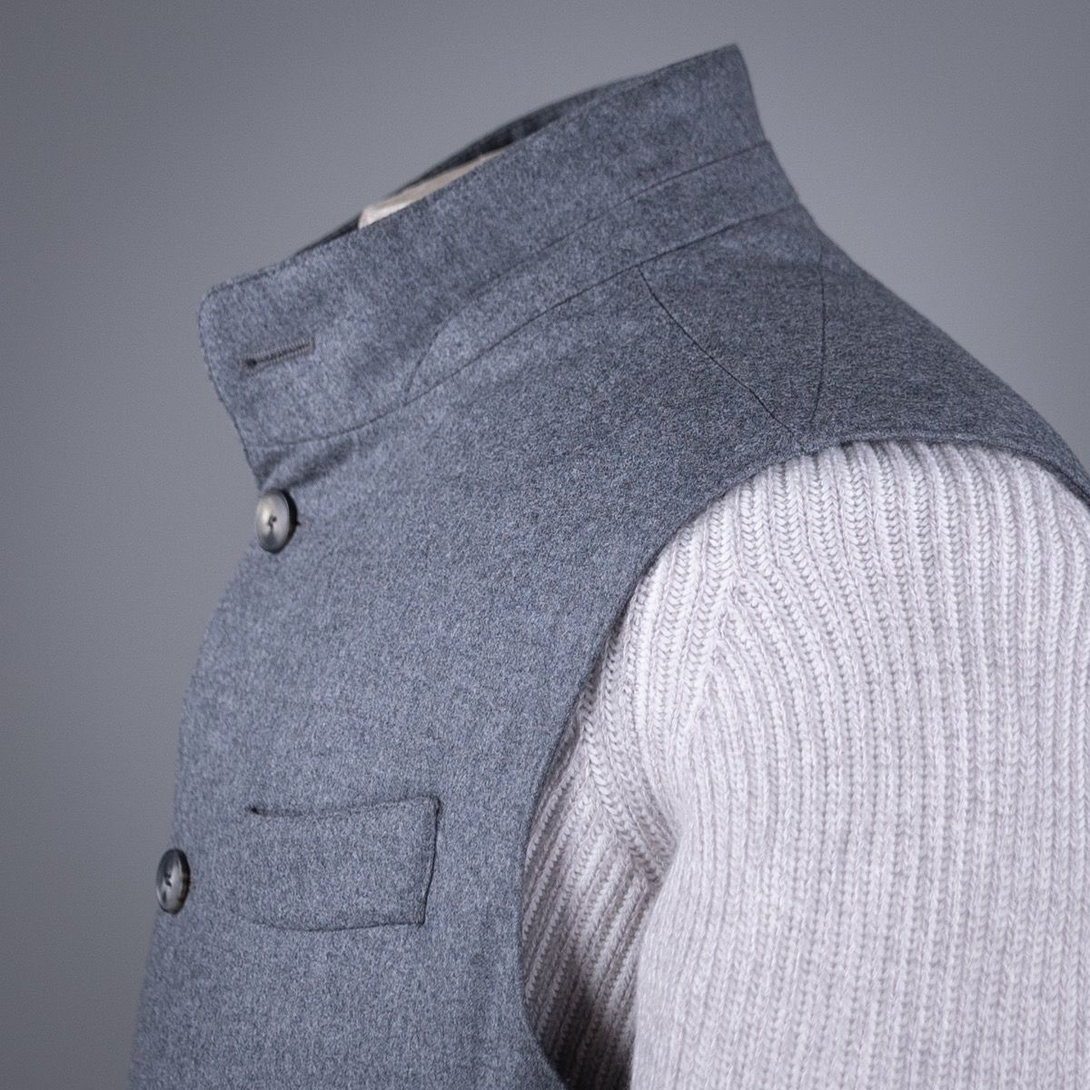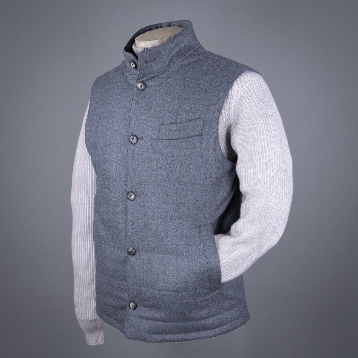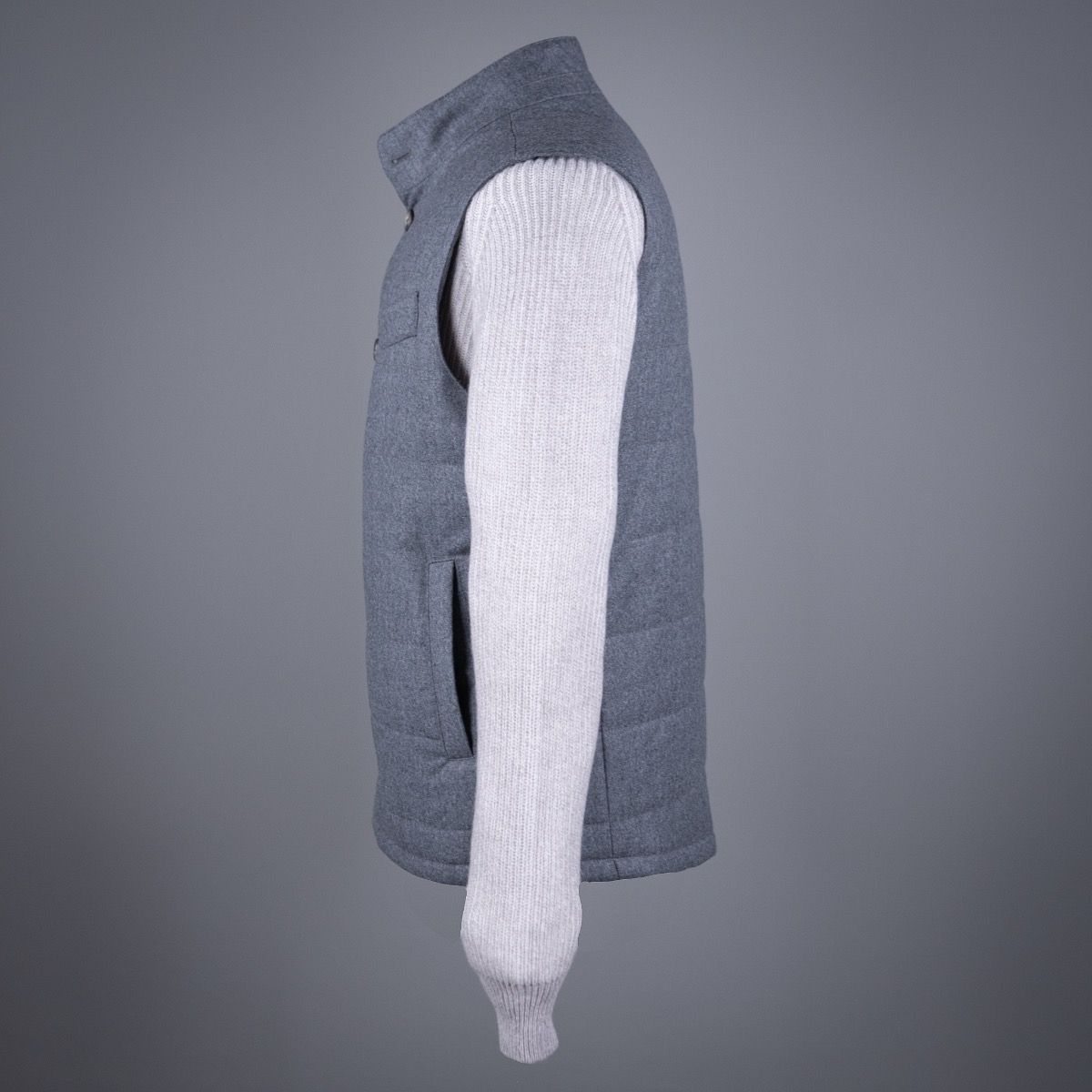 Dit vest uit de AART collectie is gemaakt van een moderne flanel stof, die ook gebruikt wordt voor pakken. De zuivere scheerwol is zo geweven dat de natuurlijke stretch van het garen behouden blijft voor extra draagcomfort. Het vest (of zo je wilt de bodywarmer) heeft een medium padding zodat deze zowel los als onder iets gedragen kan worden. Het is een elegant stuk dat het best tot zijn recht komt over een luxe trui en bij een (cord) chino.