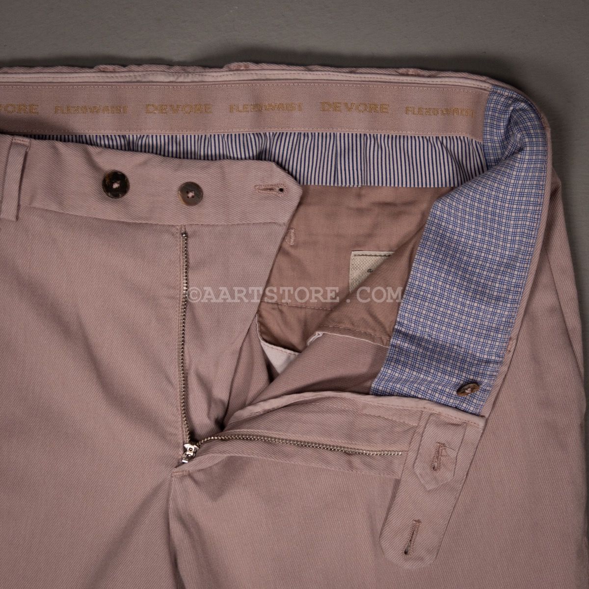 Devore is een Napolitaanse broekenspecialist. Jarenlang maakte dit familiebedrijf vooral broeken voor andere partijen en hierdoor staan ze in de business bekend als een uiterst vakkundige en betrouwbare partner. Sinds een paar jaar maakt Devore hun eigen collectie; bijzonder mooi gemaakte broeken voor een alleszins redelijke prijs. De constructie is prachtig gemaakt van verschillende materialen waardoor een speels effect ontstaat. De broekband is een uitvinding van Devore, de Flexowaist geeft extra comfort bij bewegen en zitten zonder dat de broek afzakt. Het model is eigentijds, met iets meer ruimte en een pasvorm die toeloopt naar de voet. Deze luxury twill chino is een fijne, dunne stof met een lichte keperstructuur. Deze broek biedt heel veel comfort, met veel bewegingsvrijheid. Deze chino is clean genoeg om hem te dragen bij een jasje, maar een linnen shirt of polo past ook naadloos.