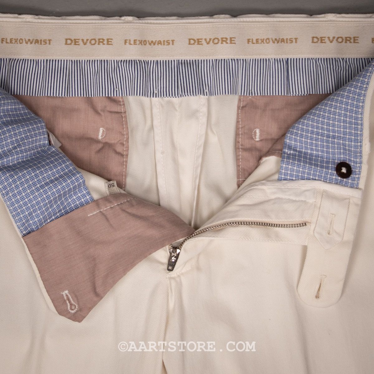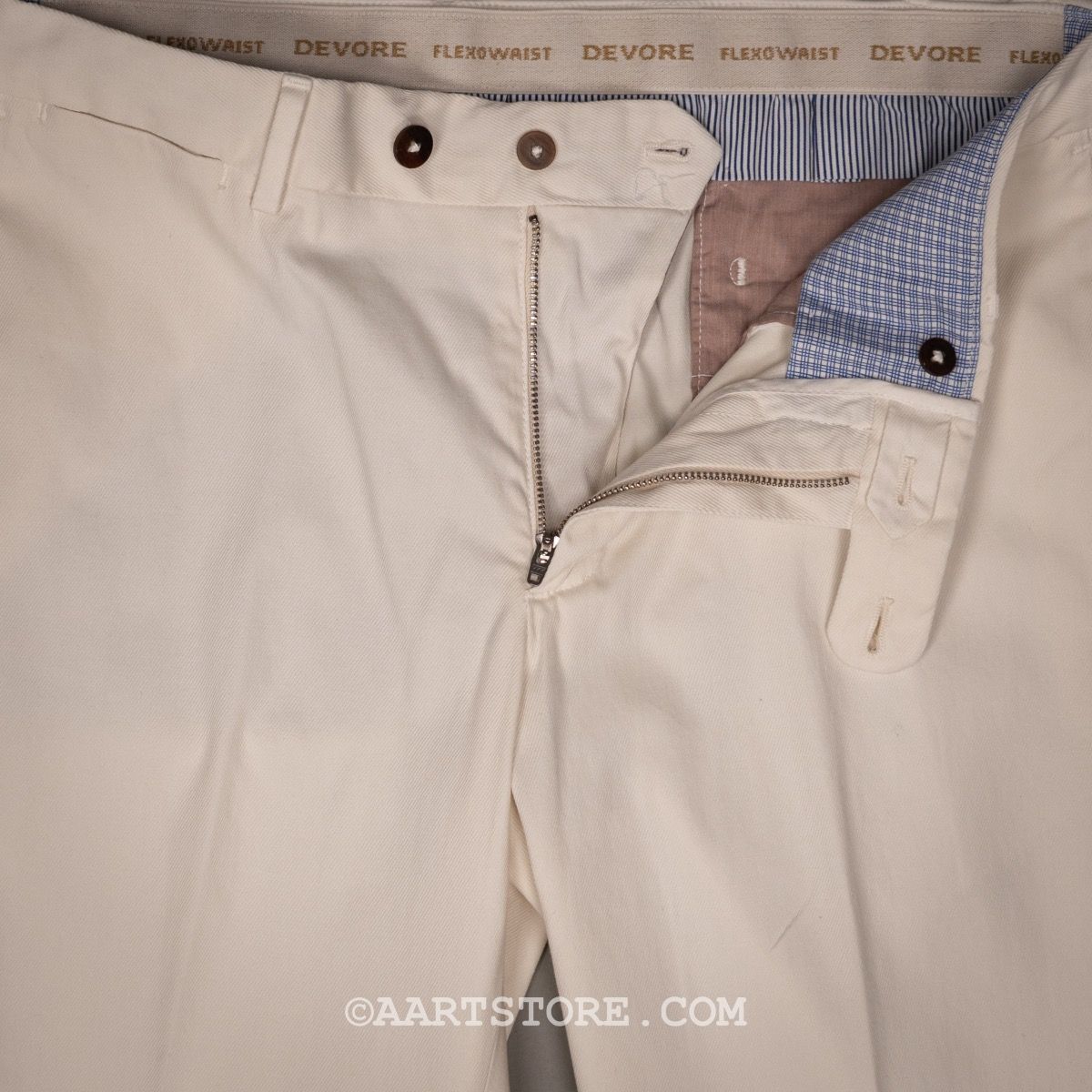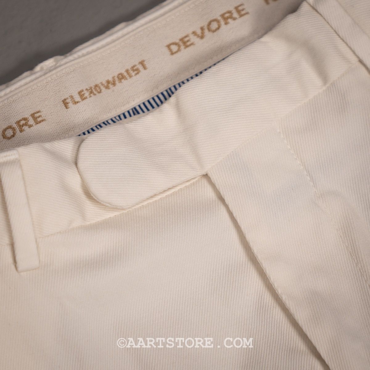 Devore is een Napolitaanse broekenspecialist. Jarenlang maakte dit familiebedrijf vooral broeken voor andere partijen en hierdoor staan ze in de business bekend als een uiterst vakkundige en betrouwbare partner. Sinds een paar jaar maakt Devore hun eigen collectie; bijzonder mooi gemaakte broeken voor een alleszins redelijke prijs. De constructie is prachtig gemaakt van verschillende materialen waardoor een speels effect ontstaat. De broekband is een uitvinding van Devore, de Flexowaist geeft extra comfort bij bewegen en zitten zonder dat de broek afzakt. Het model is eigentijds, met iets meer ruimte en een pasvorm die toeloopt naar de voet. Deze luxury twill chino is een fijne, dunne stof met een lichte keperstructuur. Deze broek biedt heel veel comfort, met veel bewegingsvrijheid. Deze chino is clean genoeg om hem te dragen bij een jasje, maar een linnen shirt of polo past ook naadloos.