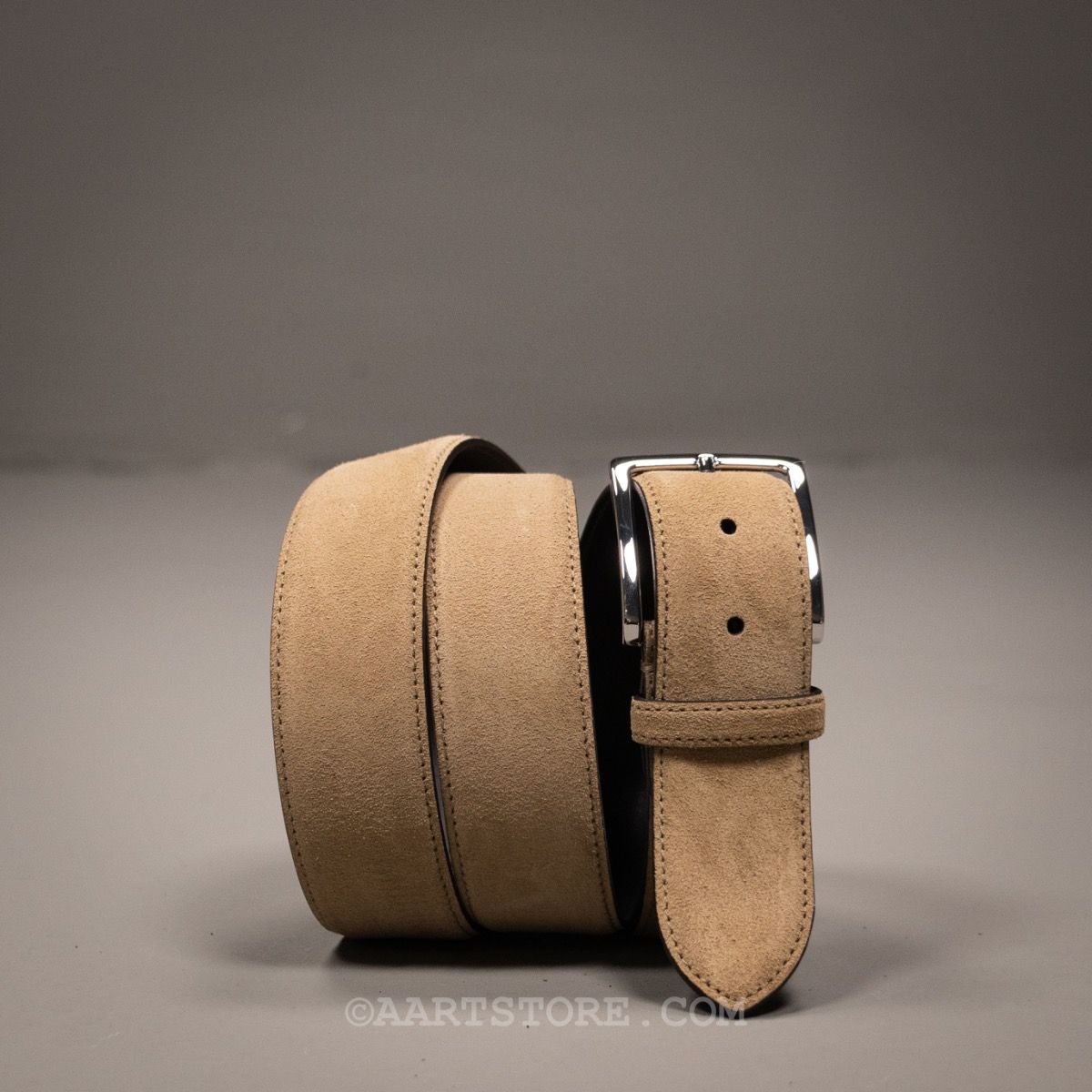 Paolo Vitale is een Italiaanse leerbewerker, gespecialiseerd in exotische leersoorten. Samen met AART maakt hij een collectie riemen die perfect past bij een luxe dressy casual look. Deze suede riem is gemaakt van zacht, soepel leer met een stoere uitstraling. Deze riem heeft een panama constructie, met een iets bol middenstuk en zichtbare stiksels met gevet garen dat perfect past bij een chino of jeans.